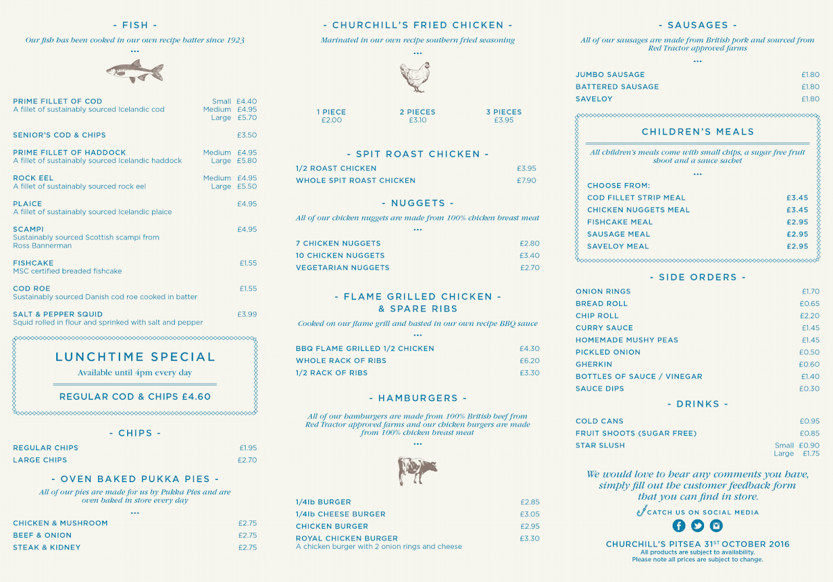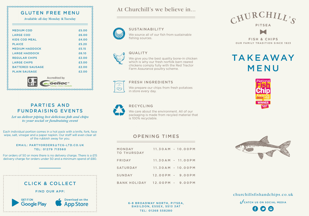 Overall, the menu at Churchill's Fish & Chips Pitsea offers a satisfying mix of classic chip shop staples with enough variety to suit different appetites. The Regular Chips and Large Chips form a reliable base, while burger options like the 1/4lb Cheese Burger, Chicken Burger, and Royal Chicken Burger add a hearty alternative to traditional fish. Sausage lovers are well catered for with choices such as the Jumbo Sausage, Battered Sausage, and Saveloy, all typical of a proper British takeaway. The side selection, including Onion Rings, Bread Roll, Chip Roll, Curry Sauce, and Homemade Mushy Peas, complements the mains nicely and enhances the overall experience. Notably, the gluten-free range-featuring items like Medium Cod, Large Cod, Kids Cod Meal, Plaice, and Medium Haddock-shows thoughtful inclusivity. For those seeking premium options, dishes such as Prime Fillet Of Cod, Senior's Cod & Chips, Prime Fillet Of Haddock, Rock Eel, and Plaice round out the menu with traditional favorites. While prices aren’t listed, the variety and classic offerings suggest good value and a menu designed to please both regulars and newcomers alike.